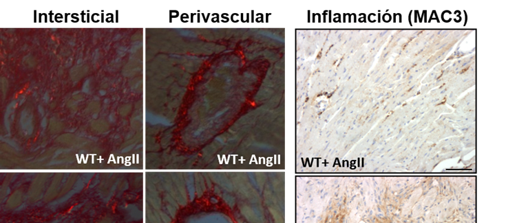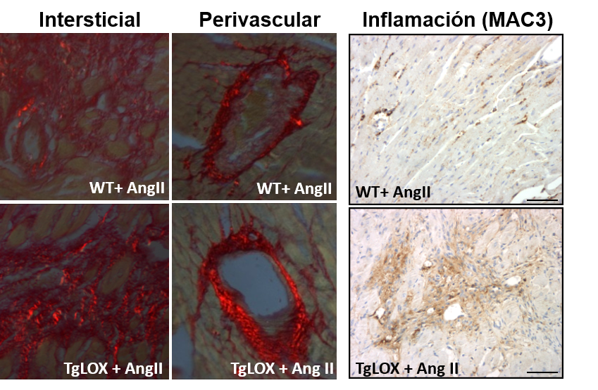 Figura: En el miocardio de los ratones transgénicos para la lisil oxidasa (TgLOX), la administración de Angiotensina II (AngII) aumenta el nivel de colágeno maduro (visualizado como refringencia roja) frente a los animales normales (WT). Los animales transgénicos presentan además mayor inflamación (paneles de la derecha)